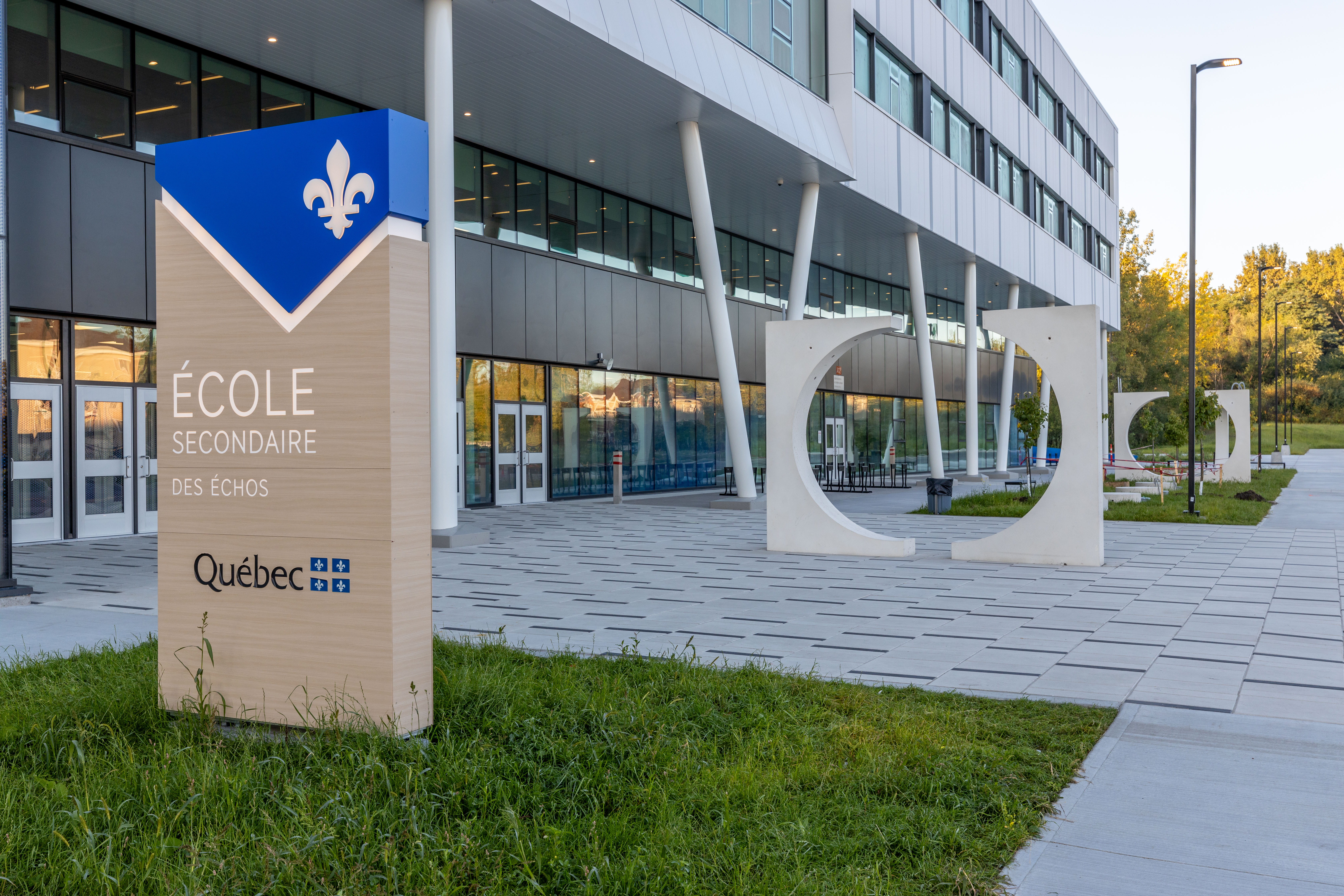 En ce qui concerne les écoles secondaires des Navigateurs, à Saint-Zotique, et des Échos, à Vaudreuil-Dorion, elles sont bâties avec des matériaux sains et durables, tels que le bois naturel, le verre et l'aluminium. Ces constructions sont aussi dotées de stratégies de réduction de la consommation d'énergie à la source, de gestion efficace de l'eau, de récupération d'énergie, de stockage thermique et d'utilisation d'énergie renouvelable à 100 %, des mesures permettant d'assurer une excellente performance énergétique. Ces établissements offrent aussi des lieux de collaboration axés sur les nouvelles réalités des élèves.