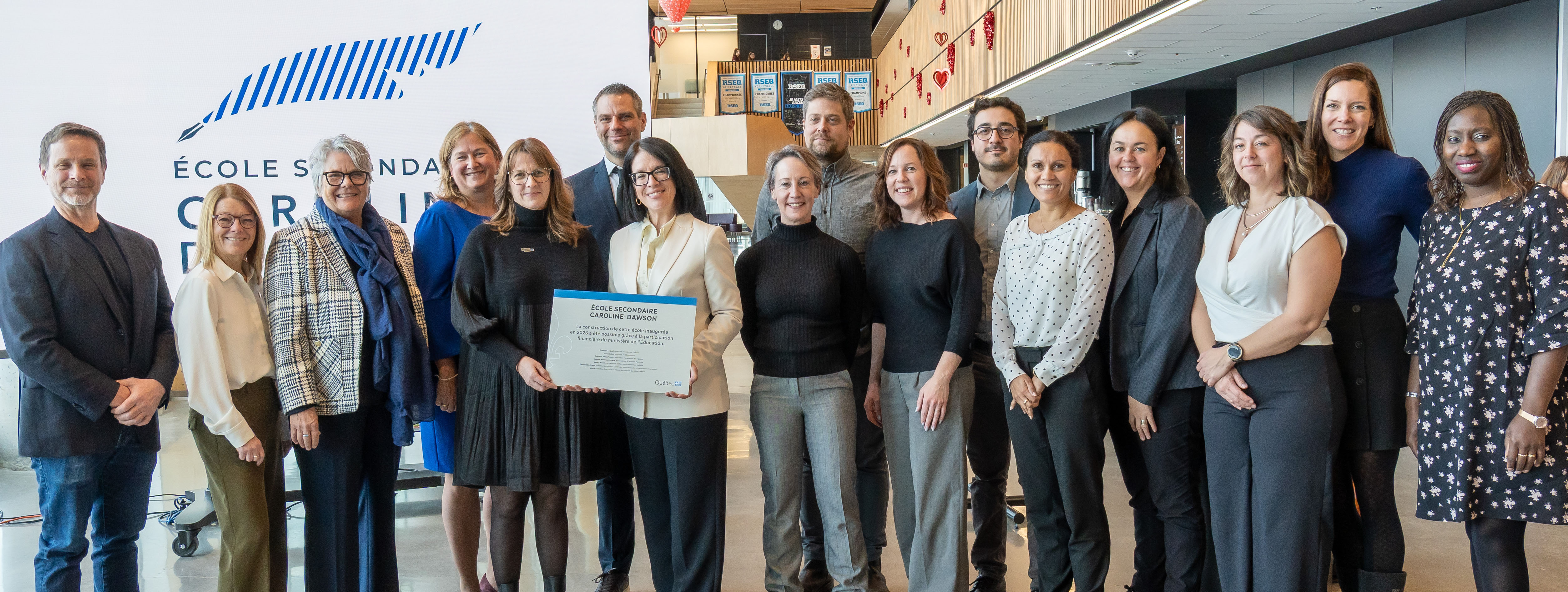 À cette occasion, le Centre de services scolaire Marguerite-Bourgeoys (CSSMB) a officiellement dévoilé le nom de l’établissement : l’école secondaire Caroline-Dawson. Ce choix rend hommage à l’auteure, enseignante et militante engagée, dont le parcours et les valeurs concordent fortement avec la mission éducative de l’école publique.