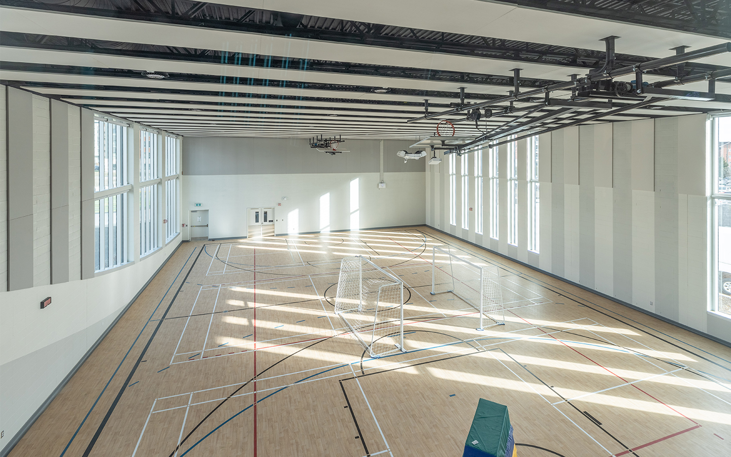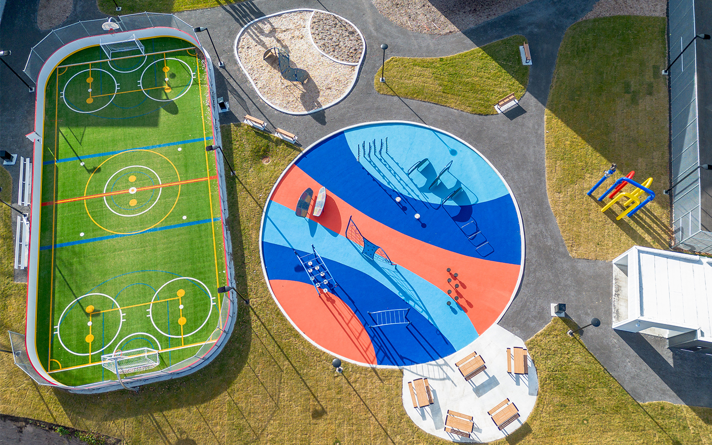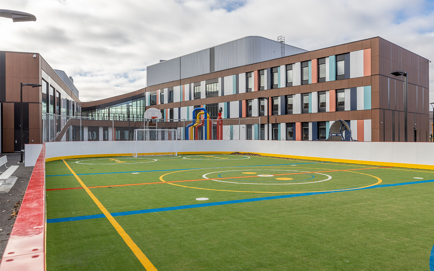 L’aménagement extérieur du site a aussi été pensé pour répondre aux critères de développement durable. Les espaces extérieurs comprennent des installations qui favorisent la pratique d’activités physiques. Le boisé existant a été conservé et le paysagement a été conçu pour être durable (choix de végétaux indigènes et adaptés, stratégie de réduction des îlots de chaleur).